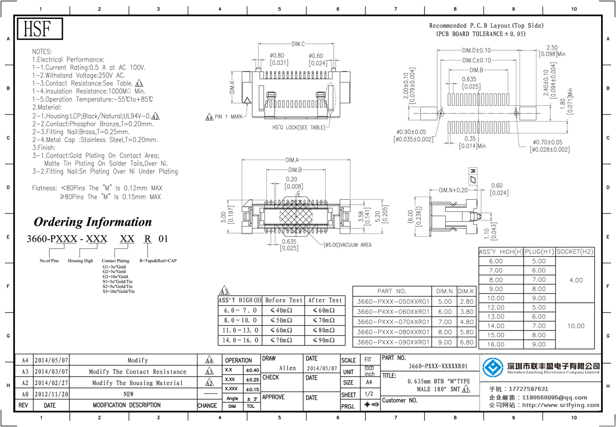 產(chǎn)品分類:Board To Board 連接器 產(chǎn)品型號(hào):0.635間距 公座 板對(duì)板 連接器 聯(lián)豐盈 技術(shù)參數(shù):額定電流:0.5amp電流電阻:60m最大絕緣電阻:100m承受電壓:AC 500V /分鐘工作溫度:40﹣℃+ 10