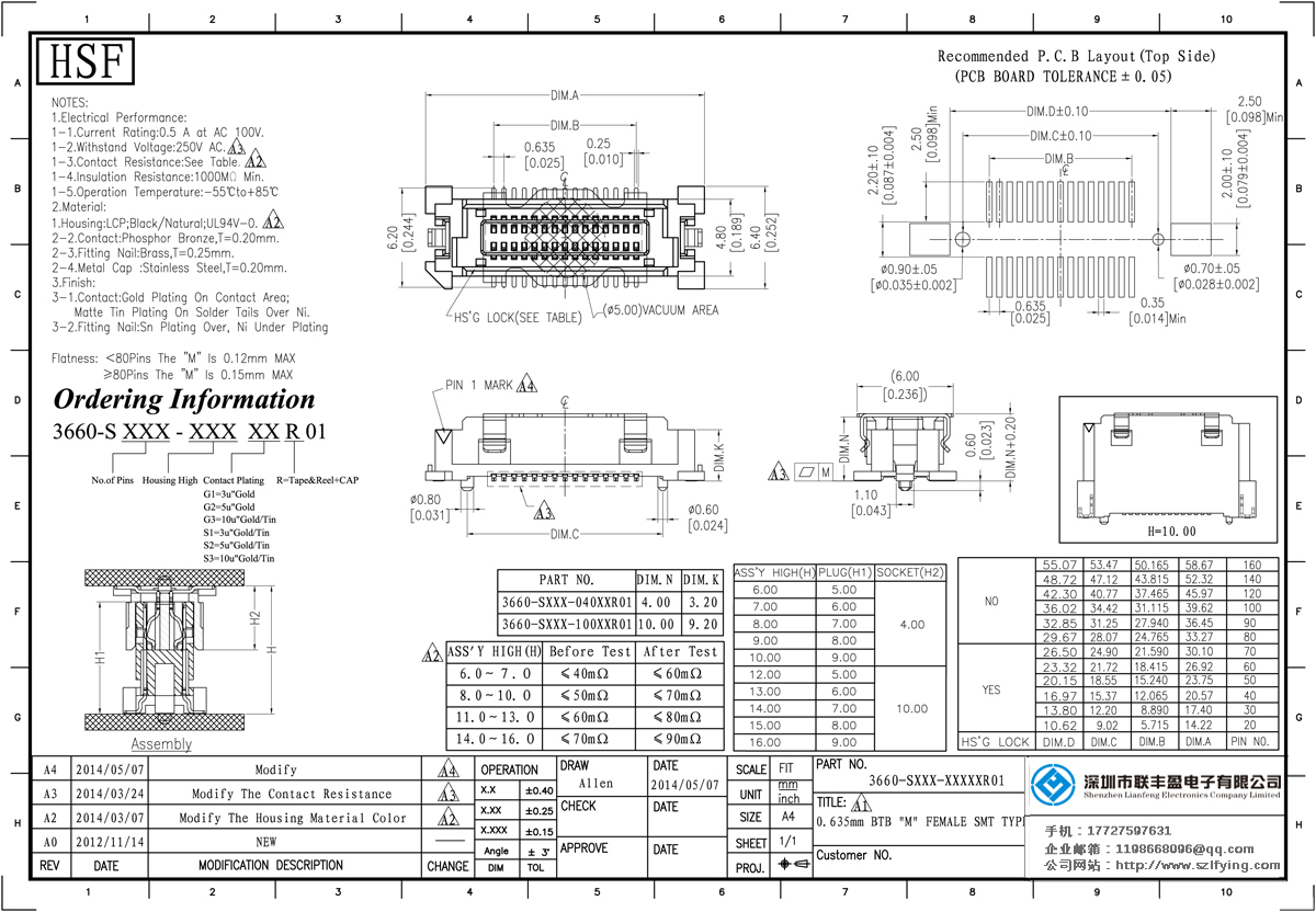 產(chǎn)品分類: Board To Board 連接器 產(chǎn)品型號:0.635MM 母座 Board To Board 聯(lián)豐盈 技術(shù)參數(shù):額定電流:0.5amp電流電阻:60m最大絕緣電阻:100m承受電壓:AC 500V /分鐘工作溫度:40﹣℃+ 105℃接觸